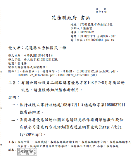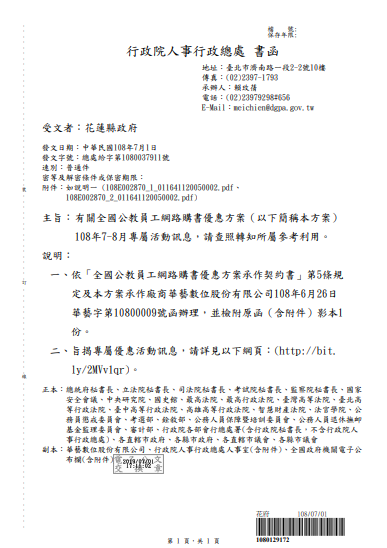 有關全國公教員工網路購書優惠方案108年7-8月專屬活動 訊息,請查照轉知所屬參考利用。