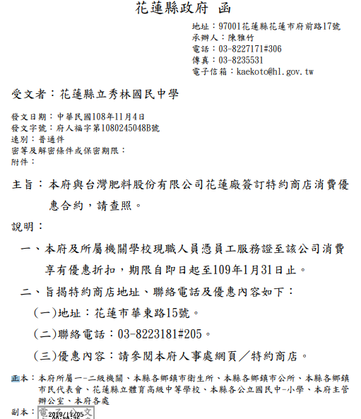 花蓮縣政府與台灣肥料股份有限公司花蓮廠簽訂特約商店消費優惠合約,請查照。