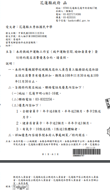 花蓮縣政府與城中運動工作室(城中運動空間.瑜珈委員會)簽訂特約商店消費優惠合約,請查照。