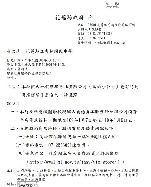 花蓮縣政府與大地假期旅行社有限公司(高雄分公司)簽訂特約商店消費優惠合約,請查照。