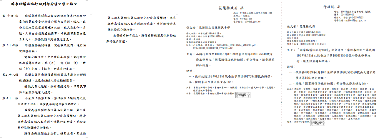轉知行政院於109年6月8日以院臺法字第1090175949號令修正發布之「國家賠償法施行細則」部分條文,請查照。