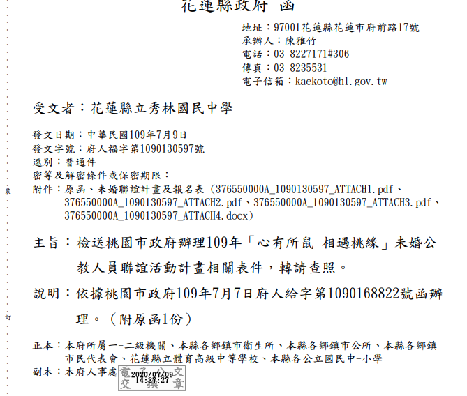 轉知檢送桃園市政府辦理109年「心有所鼠相遇桃緣」未婚公教人員聯誼活動計畫相關表件,請查照。