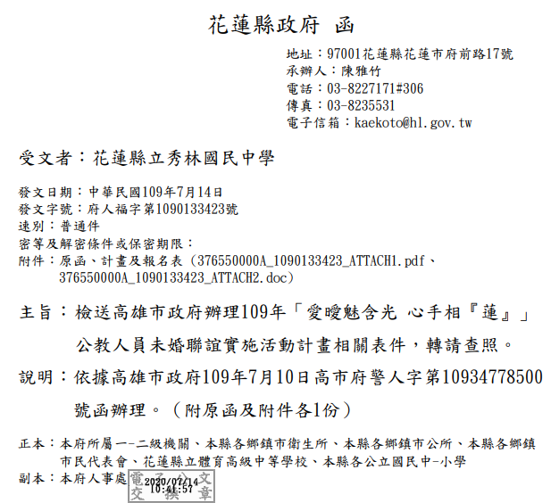 轉知檢送高雄市政府辦理109年「愛曖魅含光 心手相『蓮』」公教人員未婚聯誼實施活動計畫相關表件,請查照。