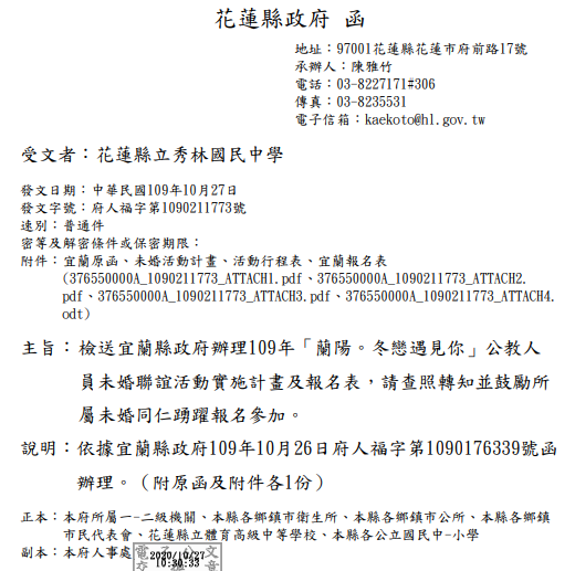 一、依據花蓮縣政府109年10月27日府人福字第1090211773號函辦理。