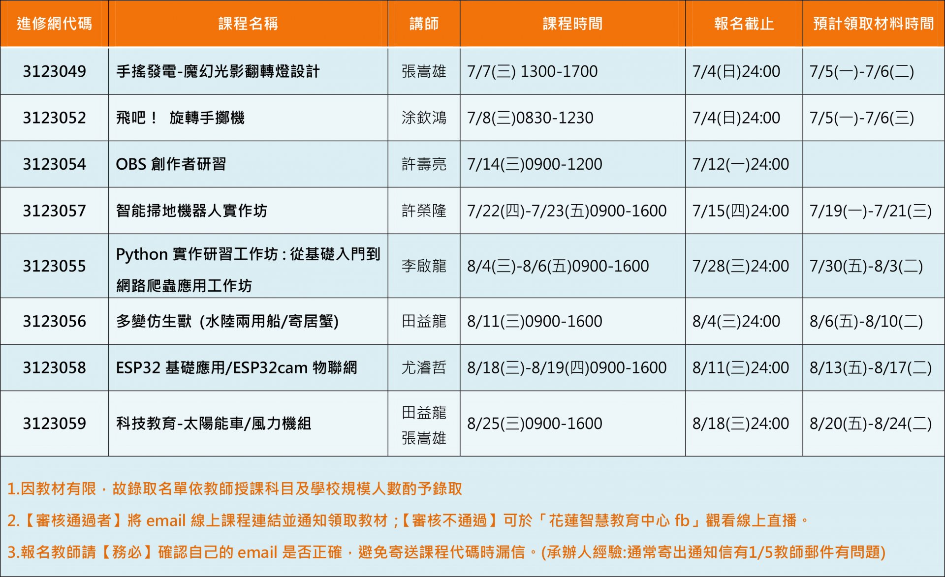 - 辦理方式:線上遠距教學。(材料方式親取/材料部分精密儀器居多,如要郵寄請自付相關郵寄費用)