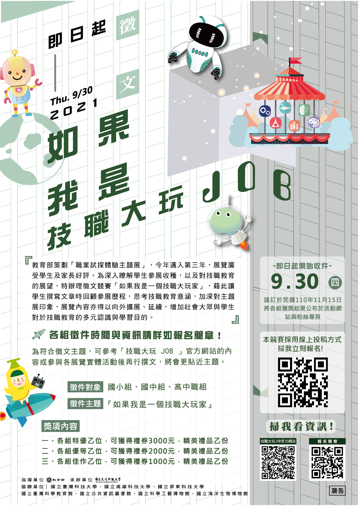 四、為能深入瞭解學生參觀展覽或體驗課程後的收穫,舉辦「如果我是一個技職大玩家」徵文競賽,有意願參加者請於110年9月30日前投稿至Google表單者(https://reurl.cc/ZGErYW),將有機會獲得1000元至3000元不等的禮券及精美禮品1份。競賽報名詳情,請參閱「技職大玩JOB」網站或「技職動起來」臉書粉絲頁。