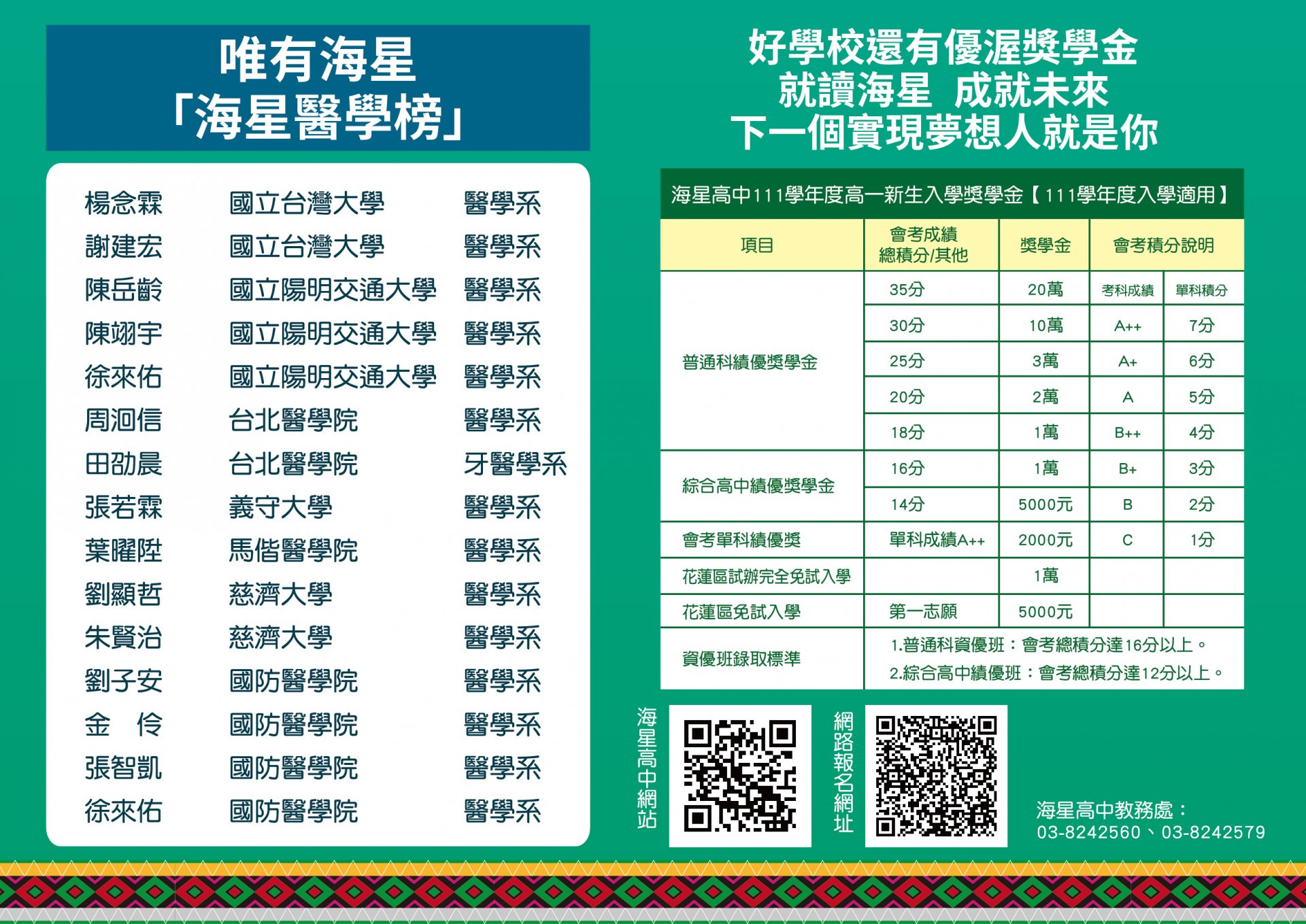 (一) 透過111學年度花蓮區高級中等學校免試入學,第一志願選填海星高中,即可獲得五千元獎學金。
