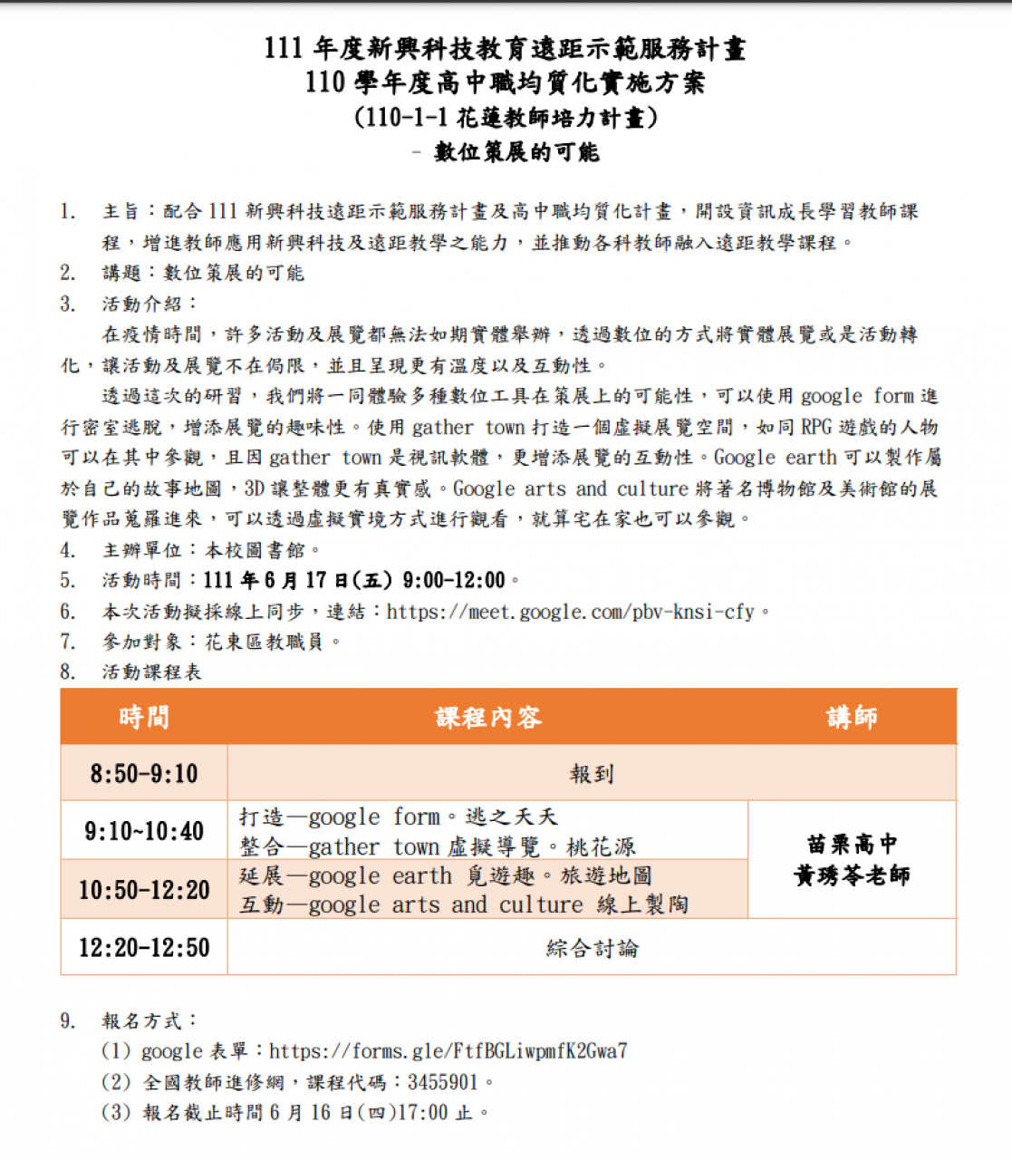 花蓮高中均質化方案「數位策展的可能研習」,歡迎同仁踴躍報名參加