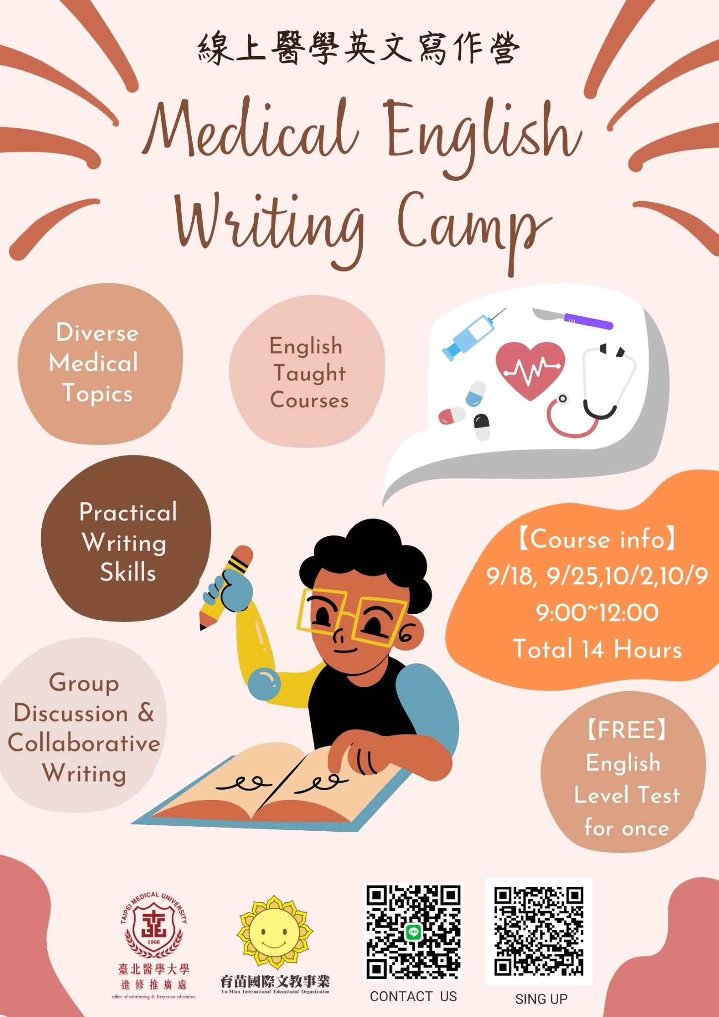 - 為促進學生對醫學領域之認知並有效提升英文實力,臺北醫學大學進推處結合本校專業醫療師資、國際師資及專業英文教育講師資源,採用營隊設計深入淺出的英文醫學寫作課程,以遠距教學擴大學生之國際視野,並以實做練習提升其英文寫作能力。【課程日期】2022/09/18(日)、 9/25(日)、10/2(日)、10/9(日),共計四天14小時。【招募對象】全國高中職學生(含應屆畢業生)對醫學或英文有興趣者。【課程費用】8800元;學校推薦者或於8/31前報名者可減免1,000元。【報名時間】即日起~2022/9/10(六)23:59 止。
