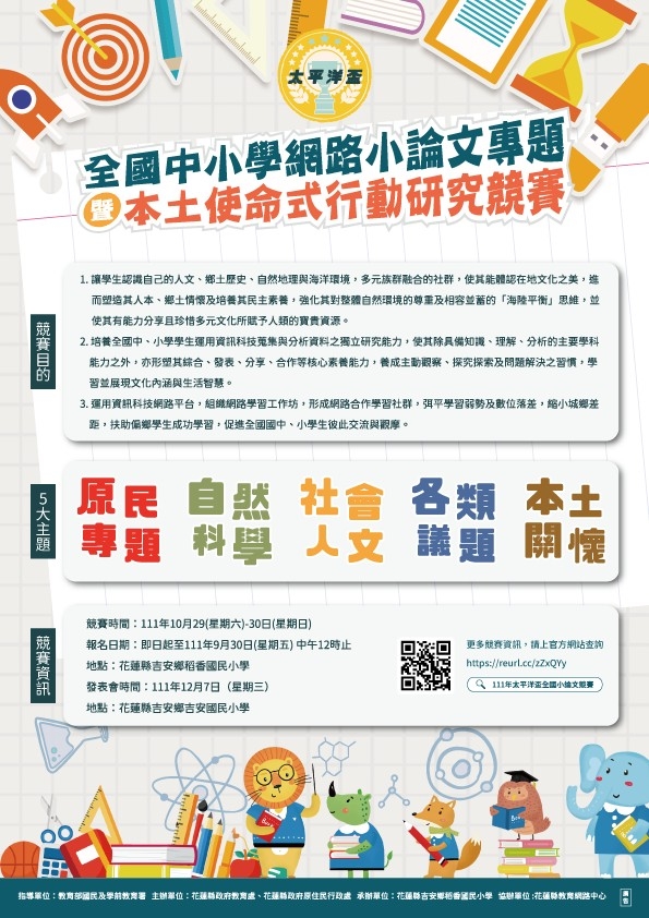 - 依據「花蓮縣太平洋盃111學年度全國中小學網路小論文專題暨本土使命式行動研究競賽實施計畫」辦理。