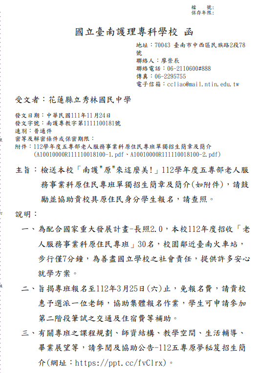國立臺南護專五專部112年度辧理老人服務事業科原住民專班單獨招生,歡迎九年級同學報考