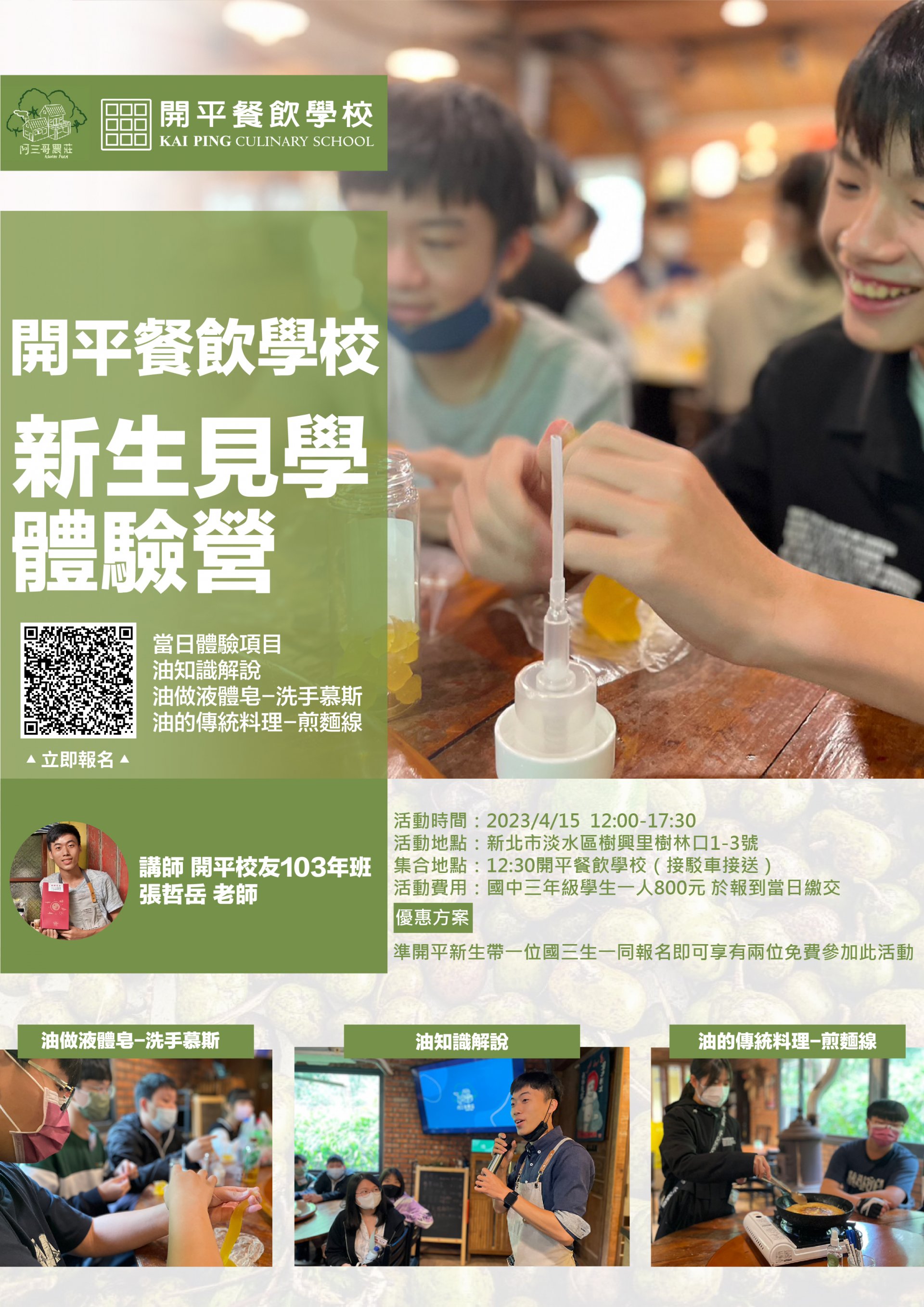 (二) 「新生見學營體驗營」:112年4月15日(星期六) 12:00-17:30;內容─農村實地體驗、產地認識,手作課程─油煎麵線、洗手慕斯、油知識解說。