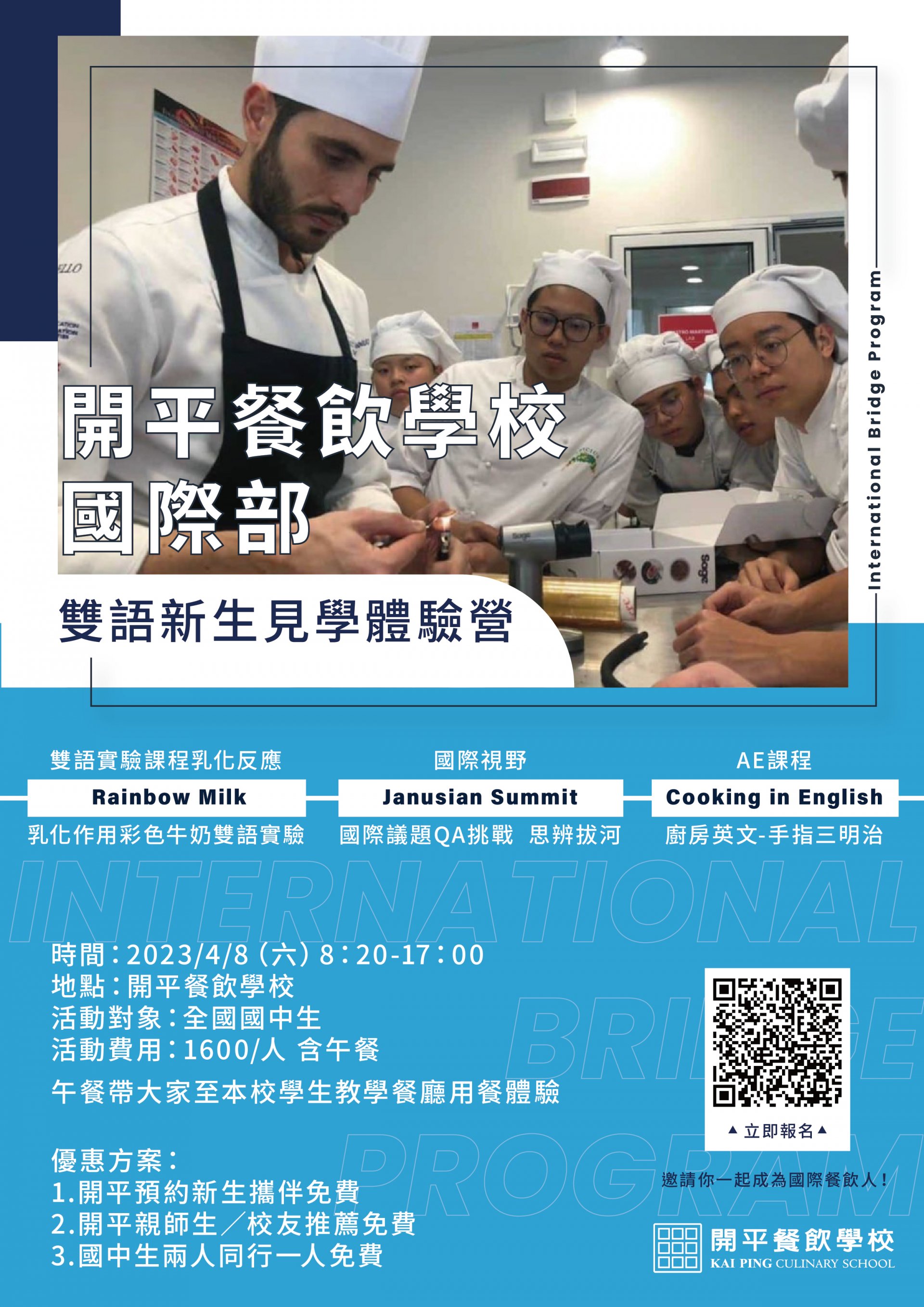 (一) 「雙語新生見學體驗營」:112年4月8日(星期六) 08:20-17:00;內容─雙語餐飲實作教學、國際視野議題、雙語實驗課程乳化反應。