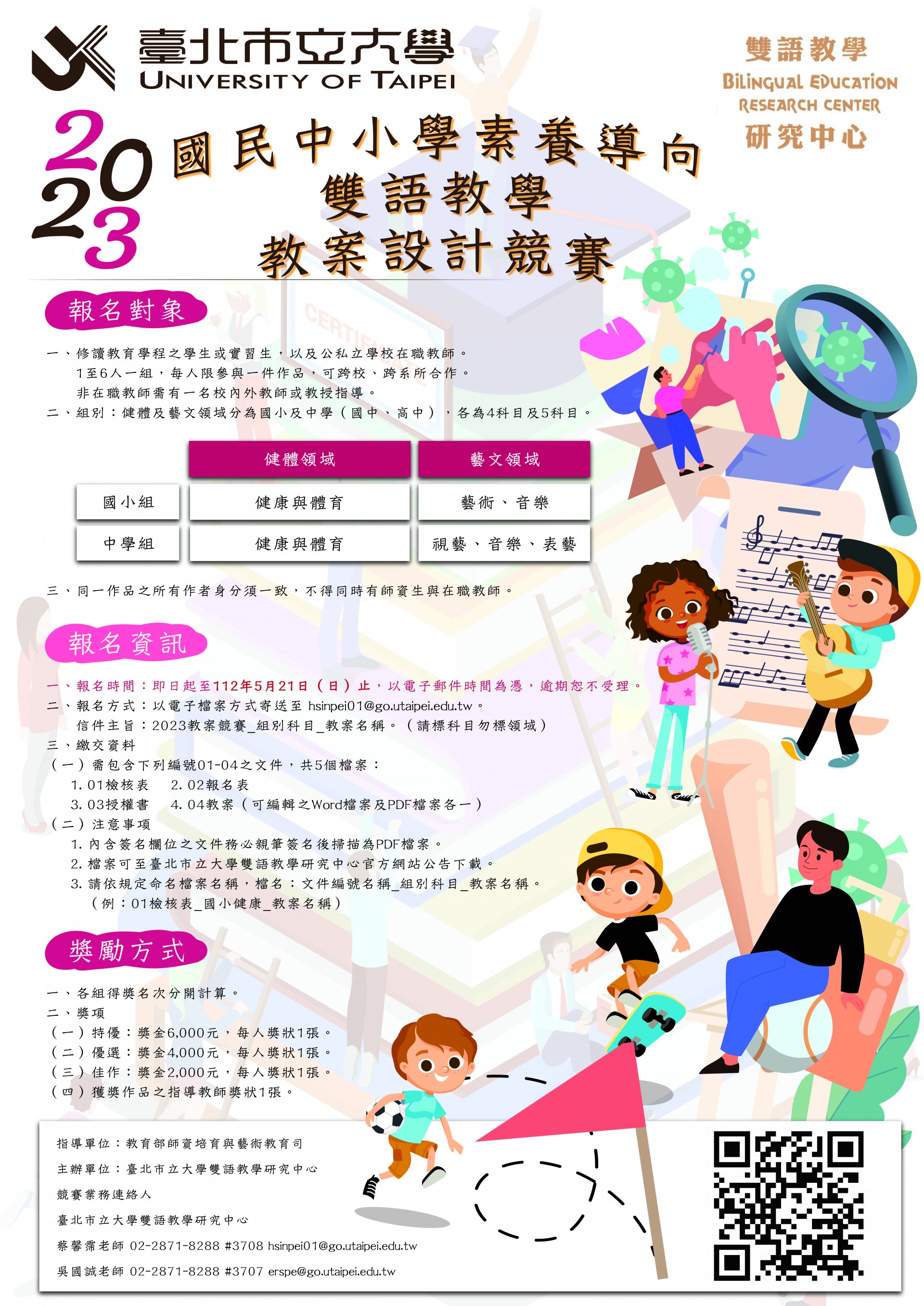 • 競賽連絡人:臺北市立大學雙語教學研究中心 蔡馨霈教師 (02)2871-8288#3708 或 hsinpei01@go.utaipei.edu.tw。