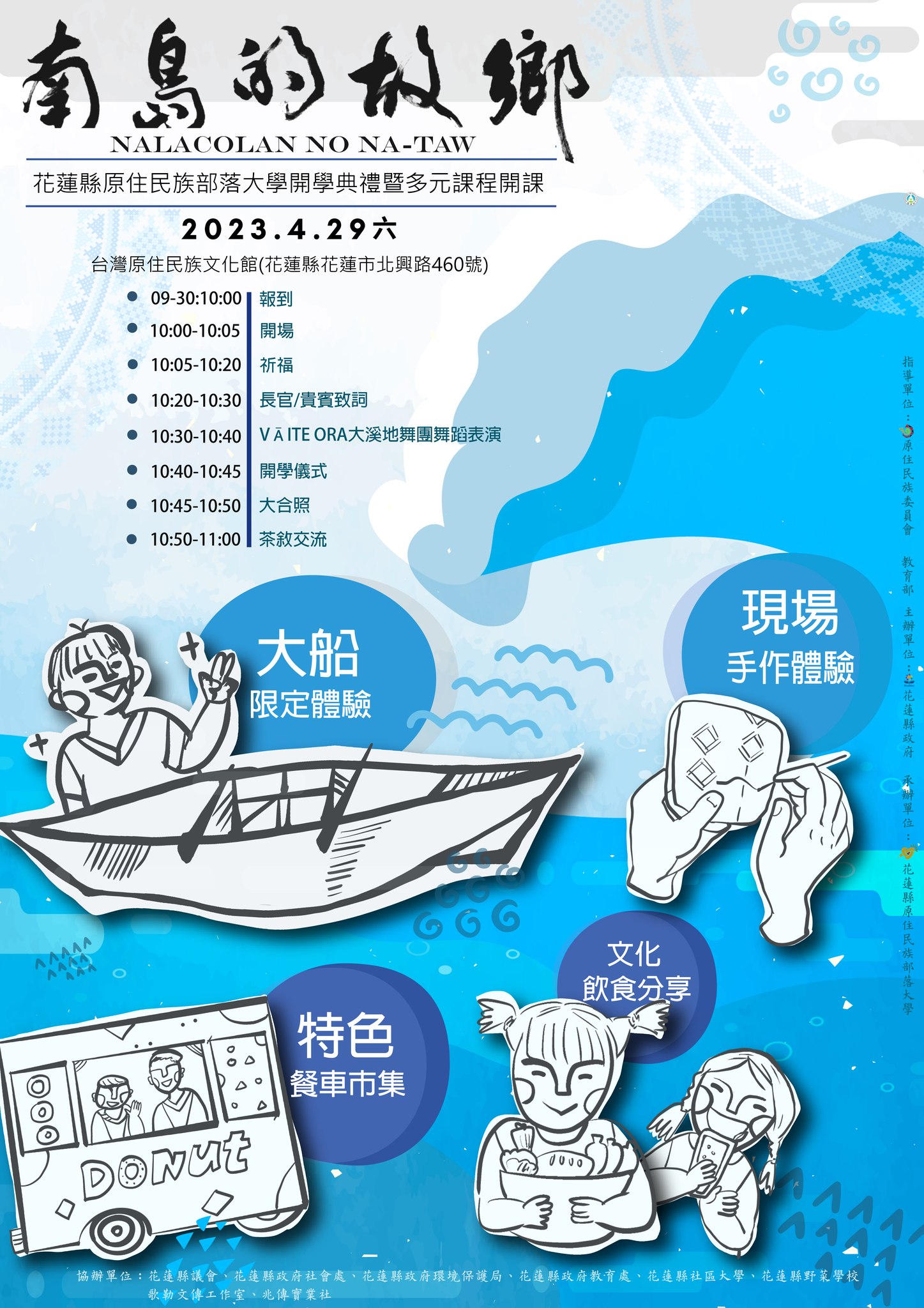 花蓮縣政府訂於112年4月29日(星期六)辦理「南島的故鄉-花蓮縣原住民族部落大學開學典禮暨多元課程開課」,敬邀蒞臨參與。