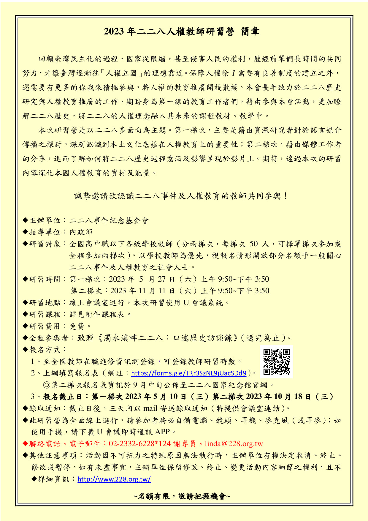 如有未竟事宜,請逕洽該會承辦人,電話:02-23326228分機124,電子信箱:linda@228.org.tw。