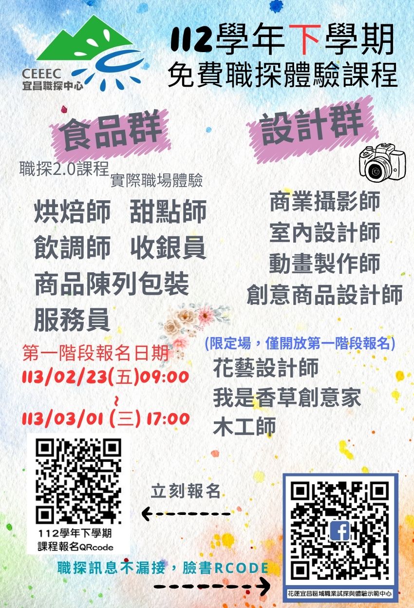 三、第一階段報名時間自113年2月23日9時起至113年3月1日17時止,請逕自前往宜昌國中校網公告中點選報名連結,或至BeClasse 線上報名系統搜尋「宜昌國中」(https://reurl.cc/RWRQZG) 進行報名作業,錄取名單將於 113年3月4日公布於職探中心粉專。