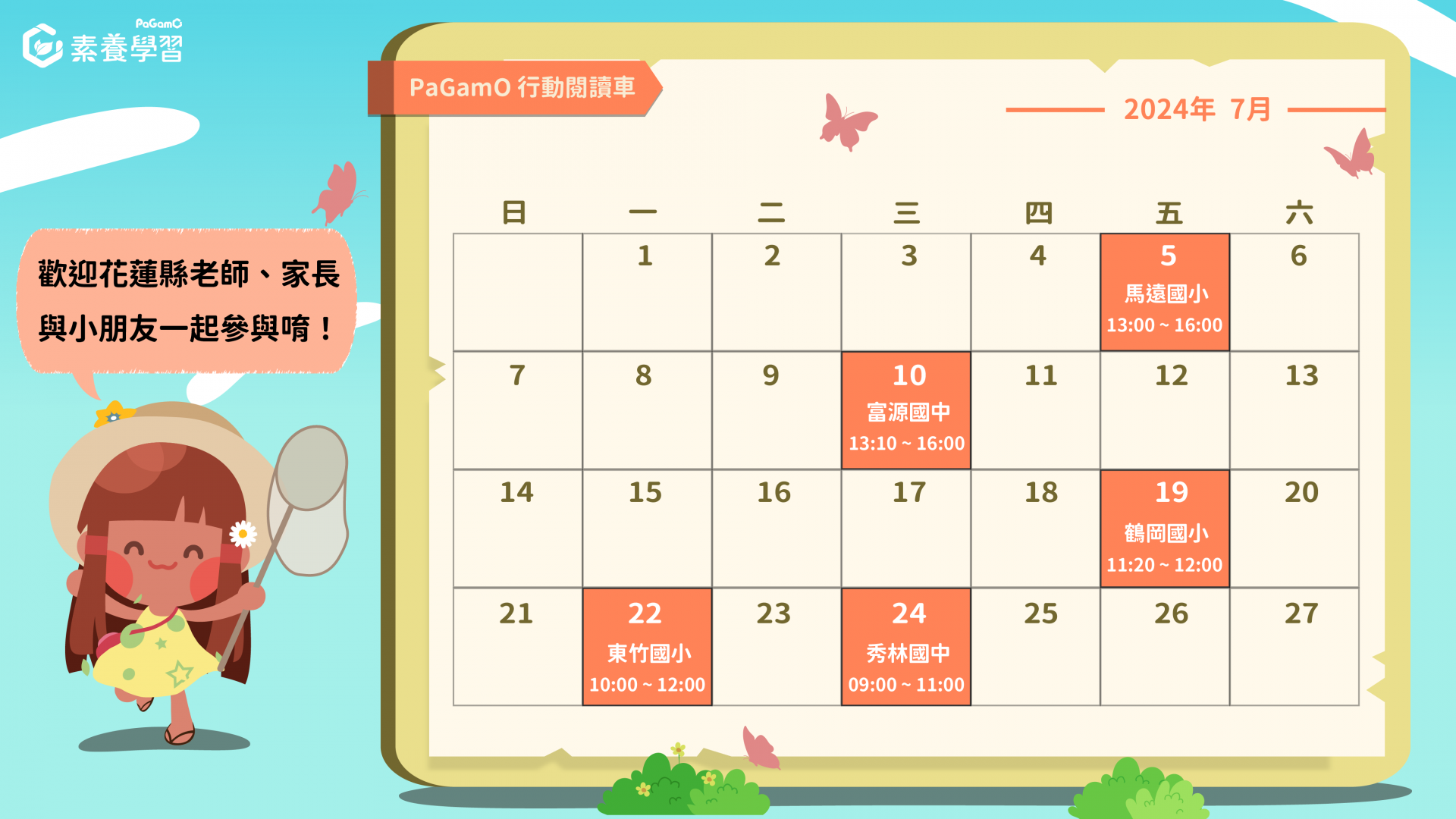 一、 | 為解決暑期學生數位學習滑波,花蓮PaGamO素養品學堂將於2024年7、8月暑假期間舉辦【行動閱讀車】活動,藉由數位閱讀與親師生互動,促進學生數位素養及閱讀習慣,活動將以實體及線上直播方式同步進行。 |
