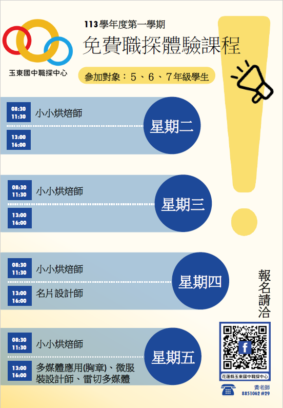 玉東國民中學開設花蓮縣區域職業試探與體驗示範中心113學年度第1學期課程簡章,請參閱