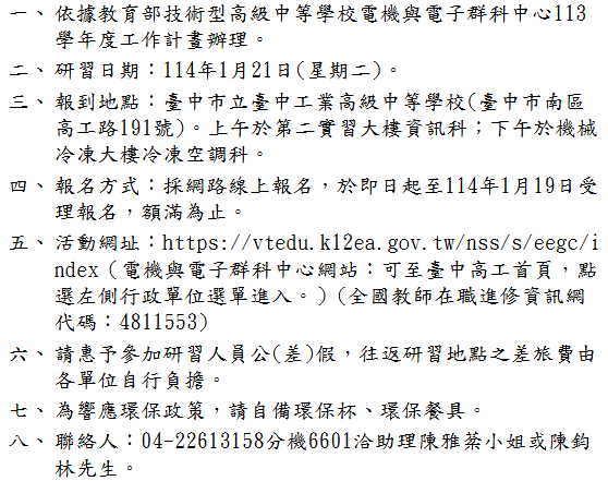 臺中高工辦理「電機與電子群專業實習課程國中教師研習」,歡迎同仁參加