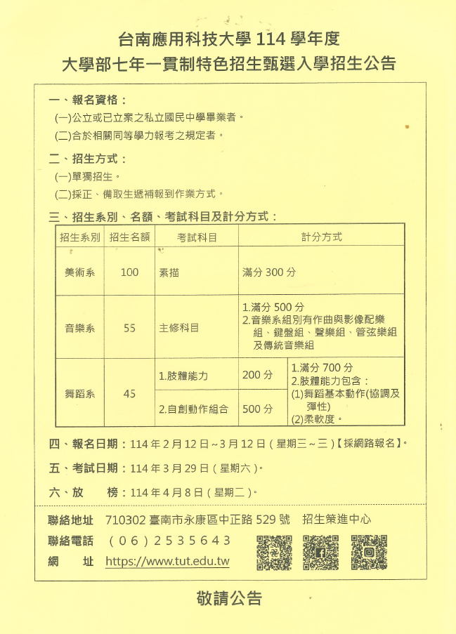 財團法人台南應用科技大學114學年度大學部七年一貫制特色招生甄選入學招生簡章