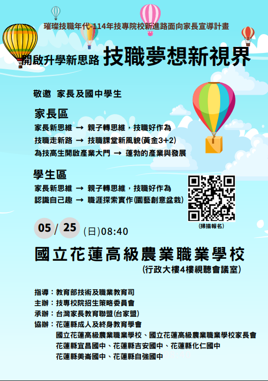 花蓮高農5月25日(日)辦理「技專院校新進路-面向家長說明宣導」,歡迎同學與家長報名參加