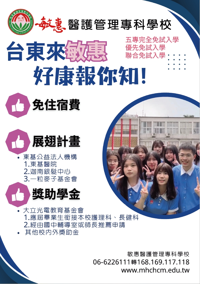 敏惠醫護管理專科學校&台東基督教醫院舉辦「人才共育暨五專入學說明會」,歡迎同學參加